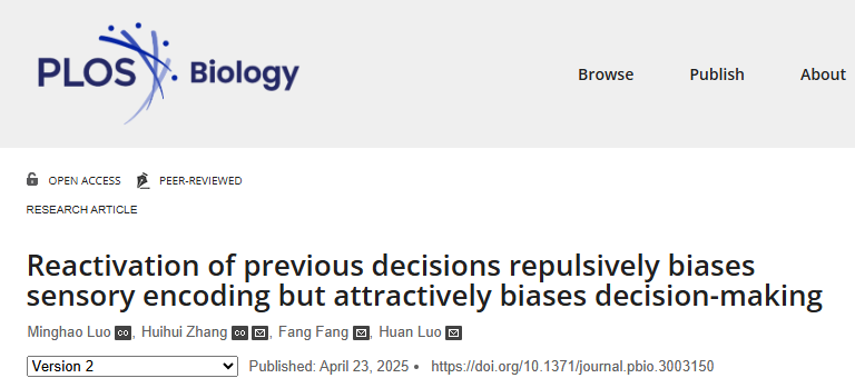 PLoS Biology | Prof. Huan Luo & Prof. Fang Fang: Reactivation of previous decisions repulsively biases sensory encoding but attractively biases decision-making