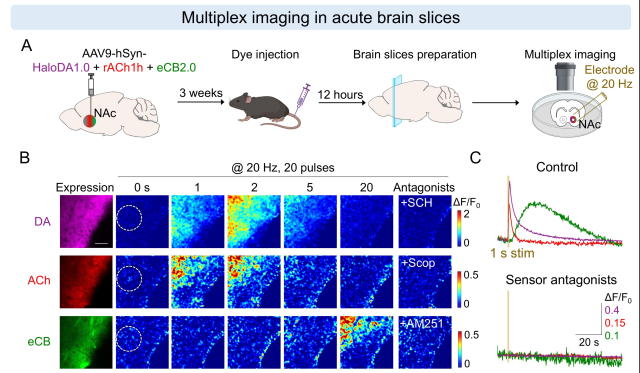 作为自然界最复杂的结构之一,人脑是一个由近千亿个神经元和数万亿个神经突触交织构成的高度精密的“生物宇宙”。在这片神经星海中,数以百计的神经递质如同永不停歇的化学信使,调控着我们的思维、记忆、情绪与行为。其中,多巴胺(dopamine,DA)作为调控奖赏、运动与学习等脑功能的“快乐分子”,常常与乙酰胆碱、内源性大麻素、五羟色胺等其它神经递质密切协同或彼此制衡;此外,多巴胺的功能还依赖于胞内信号分子如cAMP、Ca2+等在不同时空尺度下的精准调控。这些神经递质和胞内信号分子共同构成了一个高度动态、精密耦合的神经化学调控网络。近年来,领域内虽已开发出检测单种或两种神经递质的工具,却始终难以突破一个技术瓶颈——如何在活体动物脑中同步观测多种神经化学分子的实时变化?