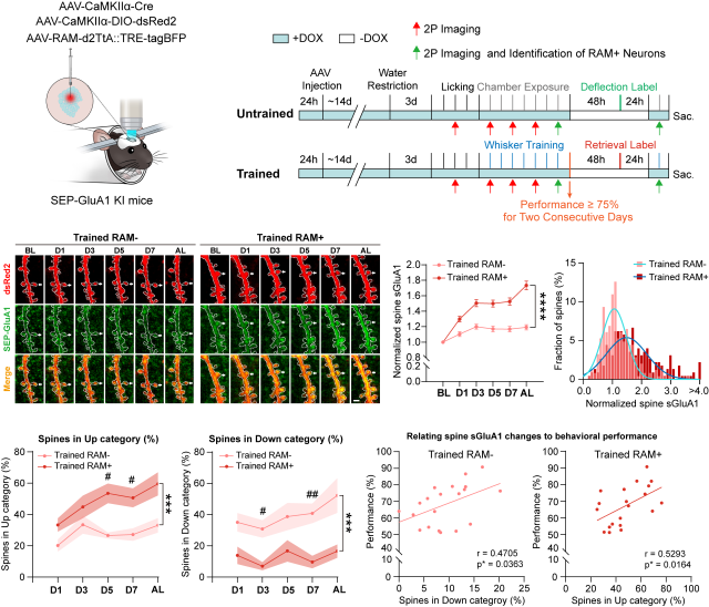 感觉学习是大脑处理信息、塑造行为和认知功能的核心过程。桶状皮层作为整合感觉信息的关键脑区在感觉记忆存储中扮演重要角色。领域内对记忆存储的机制已有初步认识,普遍认为记忆印迹细胞和突触可塑性(synaptic plasticity)共同介导这一过程;然而,记忆形成和提取过程中印迹细胞在突触可塑性层面如何变化,突触可塑性关键分子AMPA受体在此过程中是否存在神经元集群特异性的动态调控,尚未得到清晰地阐释。为此,张勇团队采用RAM(Robust Activity Marking)系统标记活性神经元集群,并结合在体双光子成像、光遗传学、化学遗传学和电生理记录等技术,探索了桶状皮层感觉记忆相关印迹细胞的突触重塑规律。