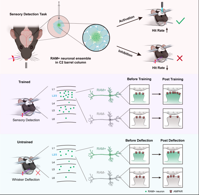 研究发现桶状皮层中RAM系统标记的活性神经元(RAM+神经元)与小鼠胡须感觉检测任务(Sensory detection task)中感觉记忆编码直接相关:激活RAM+神经元可诱发舔水行为(模拟感觉感知),抑制该群体则显著降低任务表现(图1)。不同层的桶状皮层神经元对感觉学习呈现差异化的响应模式,通过系统对比活化神经元的群体组成、电生理特性及树突棘变化等特征,作者发现感觉学习主要募集L2/3的兴奋性神经元为记忆印迹细胞,并发生特异性修饰。