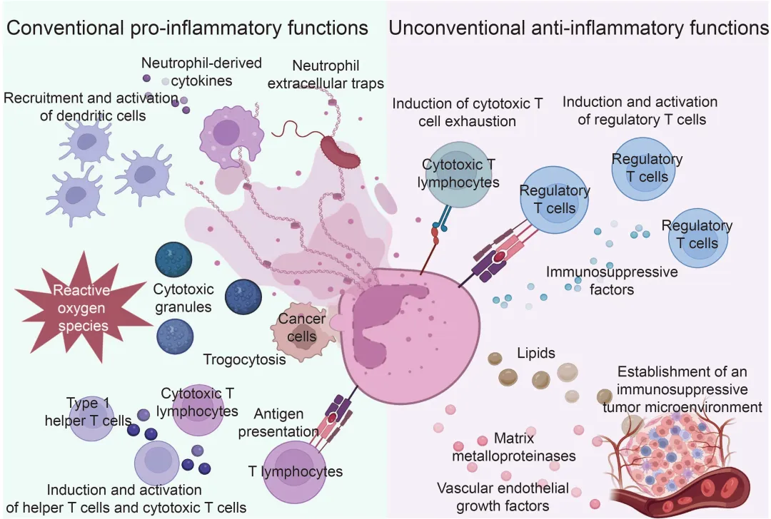 中性粒细胞(neutrophils)是机体内数量最多的免疫细胞,在外周血中可占到白细胞总数50%以上,是免疫系统的核心效应细胞之一。经典研究已长期阐明,中性粒细胞在病原防御、炎症反应、组织修复等生理或病理过程中均发挥重要功能。但是,近年来免疫学领域的研究成果开始提示,中性粒细胞有着以往未被充分认识的、显著的功能可塑性,例如可以通过中性粒细胞胞外陷阱(neutrophil extracellular traps)和抗原呈递抑制肿瘤进展、同时通过表达免疫抑制性信号促进肿瘤免疫逃逸。然而值得注意的,中性粒细胞是否具有泛疾病(pan-disease)共性特征则尚待阐明。